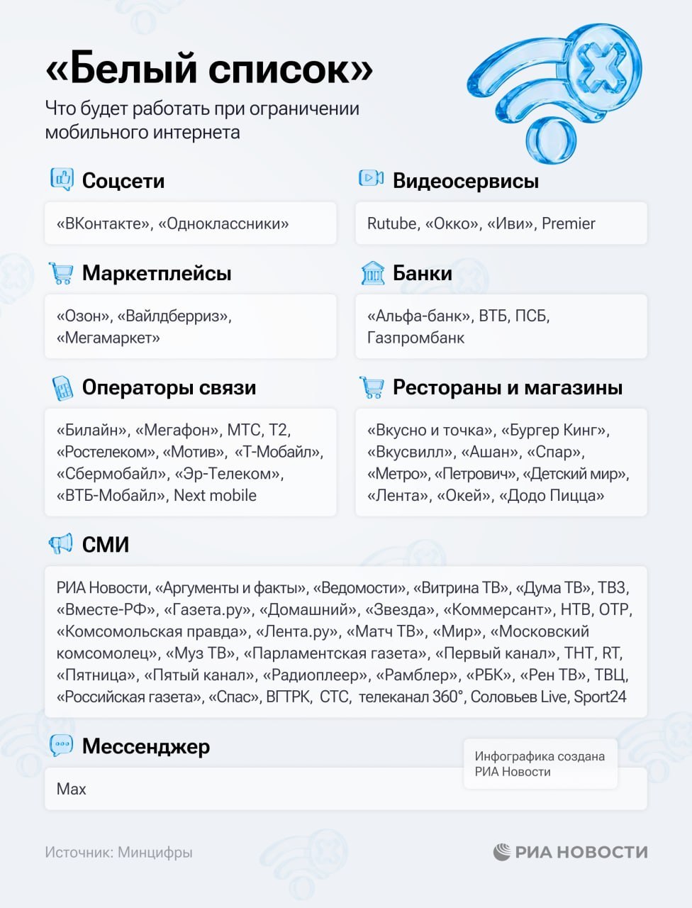 Минцифры сообщило о расширении «белого списка» сайтов, которые обязаны оставаться доступными при отключениях мобильного интернета. В него, помимо прочего, включены телеканал «Соловьёв Live», движение «Общероссийский народный фронт», поисково‑спасательный отряд «ЛизаАлерт» и общество «Знание».